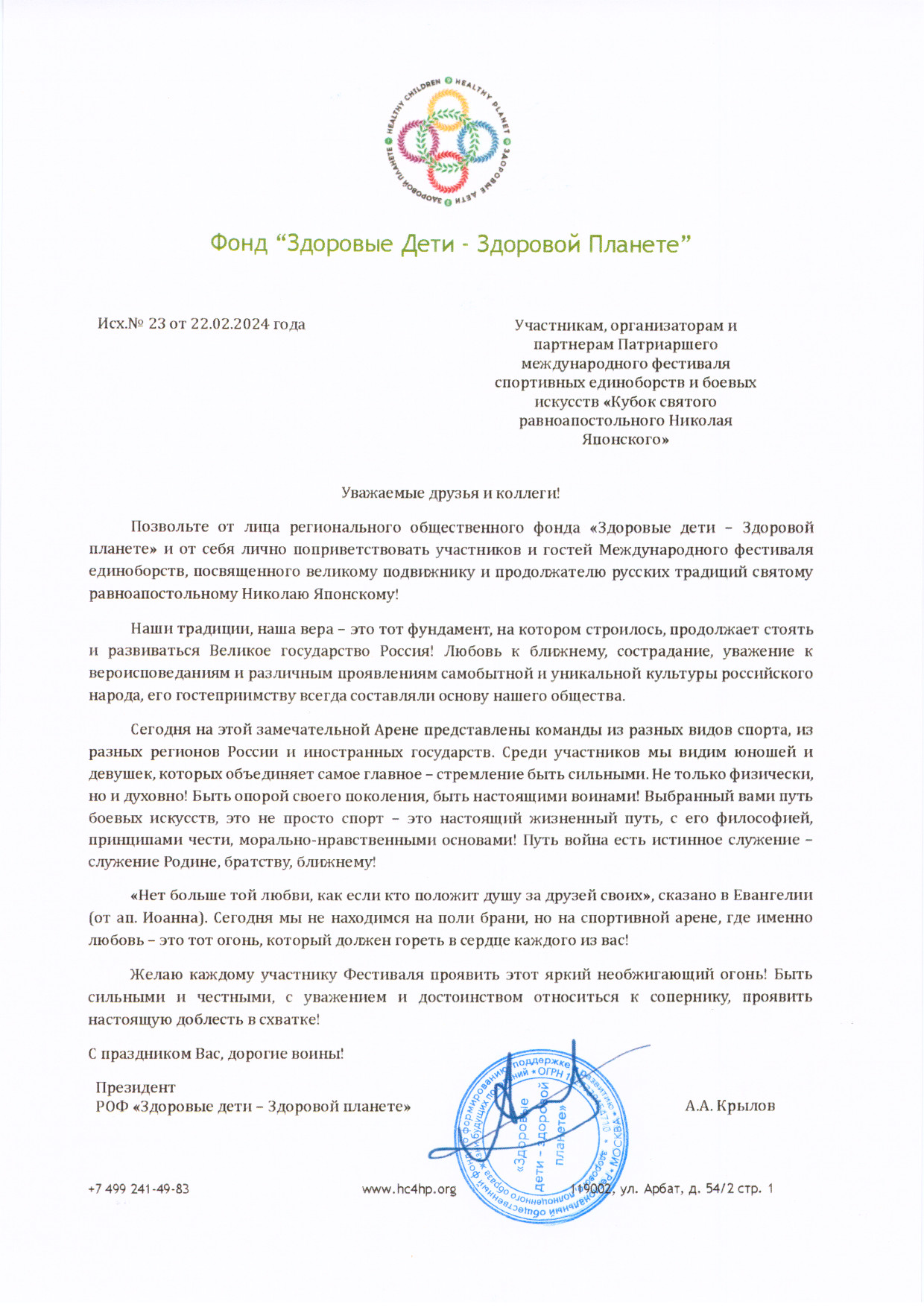 Приветствие Фонда Здоровые Дети Здоровой Планете